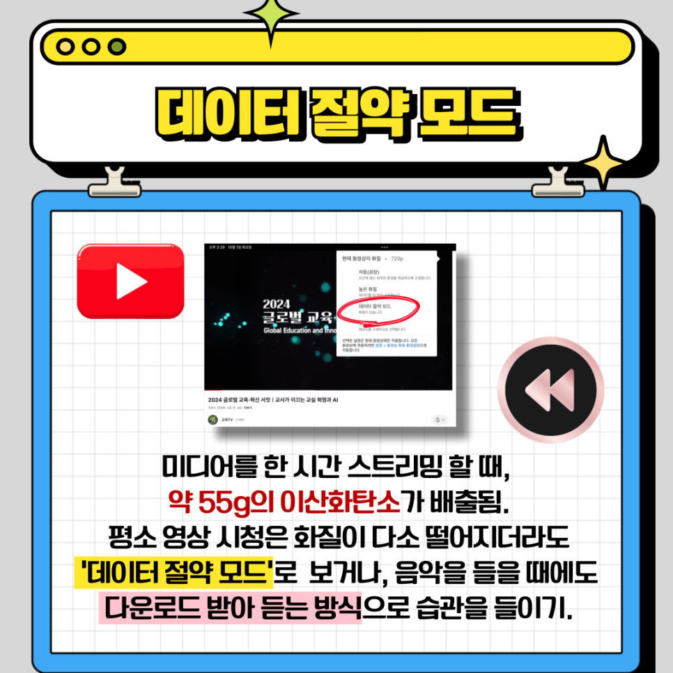 두 번째는 영상 데이터 절약 모드입니다. 여러분, 유튜브 영상과 음악 스트리밍 서비스가 상당한 양의 이산화탄소를 배출하고 있다는 사실을 알고 계셨나요? 영국의 탄소 저감 비영리 기관인 카본 트러스트(The Carbon Trust)에 따르면, 한 시간 동안 음악이나 동영상을 스트리밍할 때 발생하는 이산화탄소의 양은 약 55g에 달한다고 합니다.