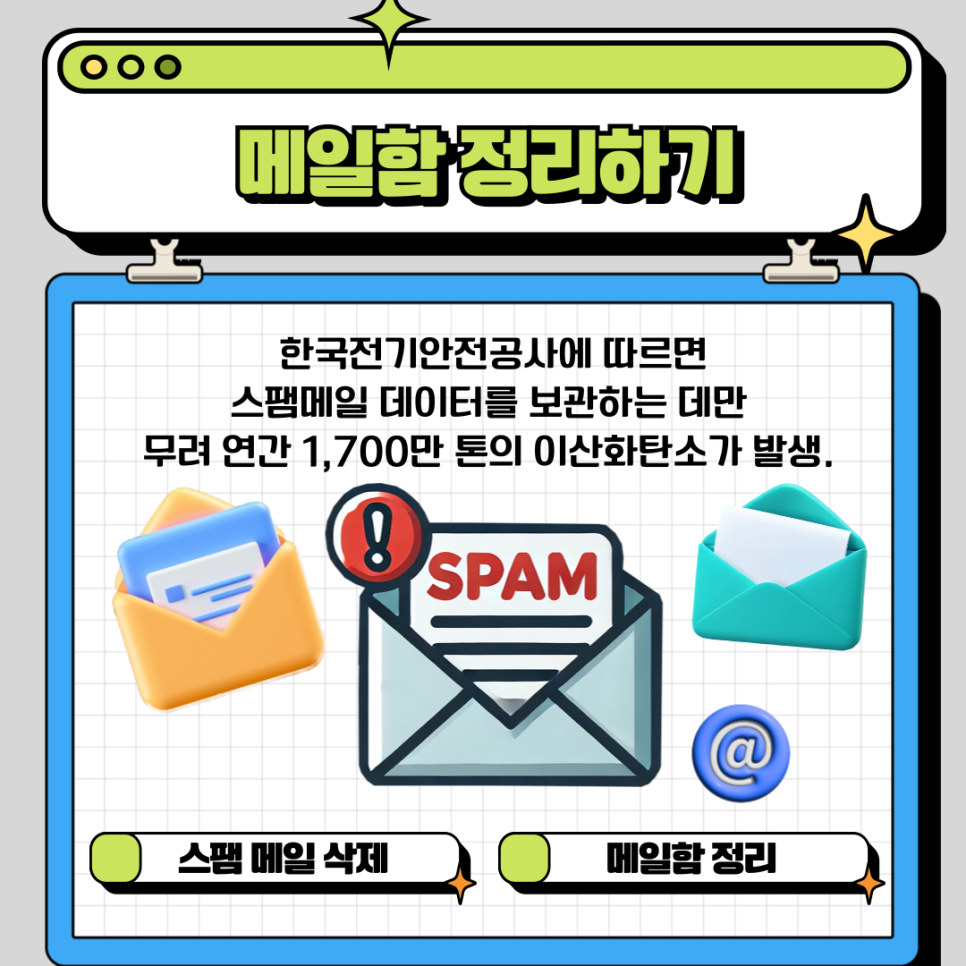첫 번째는 메일함 정리하기입니다. 한국전기안전공사에 따르면 스팸메일 데이터를 보관하는 것만으로도 연간 1,700만 톤의 이산화탄소가 발생한다고 합니다. 그만큼 스팸메일과 불필요한 메일을 삭제하는 것이 중요합니다. 저도 정기적으로 받은 편지함을 점검하고 불필요한 메일을 삭제하는 습관을 들이고 있는데요. 이러한 작은 실천이 환경 보호에 기여할 수 있다는 점을 잊지 말아야 합니다. 우리 함께 디지털 공간을 정리하고 지구를 지키는 데 힘을 보태는 것은 어떨까요?