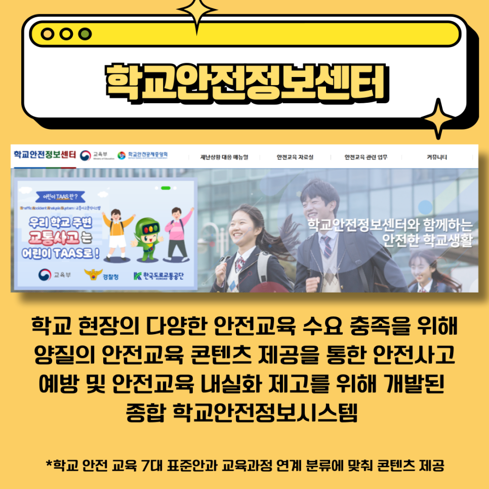 학교안전정보센터는 학교 현장에서 다양한 안전교육 수요를 충족하기 위해 양질의 안전교육 콘텐츠를 제공하고 있습니다. 이 누리집은 교육부와 학교안전공제중앙회의 협업으로 개발된 종합 학교안전정보시스템으로, 학생들의 발달 단계에 맞춰 체계적인 안전교육을 진행할 수 있도록 설계된 7대 안전교육 표준안과 교육과정 연계 콘텐츠를 제공합니다.