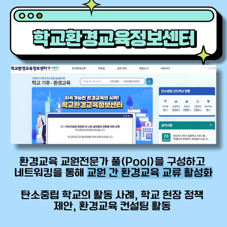학교환경교육정보센터는 환경교육을 담당하는 교원 전문가 풀(Pool)을 구성하고, 교원 간 환경교육 교류를 활발히 진행하고 있습니다. 이 센터에서는 교원 연수와 행사 참여를 독려하며 탄소중립 학교의 활동 사례를 공유하는 등 다양한 정보를 확인할 수 있습니다. 특히, 몽골 사막화 방지 숲 조성 프로그램은 학생들이 기후 위기 극복을 위한 행동을 실천하고 고민할 기회를 제공한 인상 깊은 프로그램 중 하나입니다.