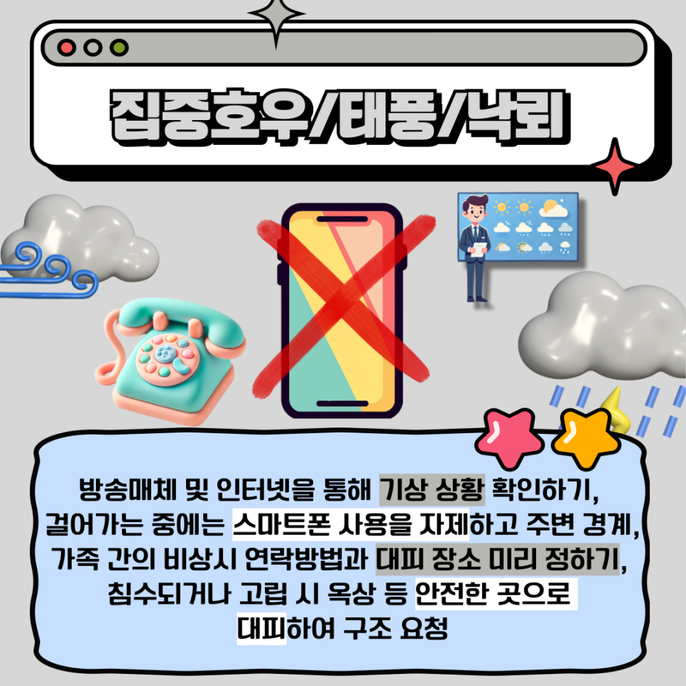 태풍, 집중호우, 낙뢰와 같은 극단적인 날씨가 예고될 때는 방송 매체와 인터넷을 통해 기상 상황을 수시로 확인해야 합니다. 만약 외출 중이라면 스마트폰 사용을 자제하고 주변을 경계하며, 가족 간 비상 연락 방법과 대피 장소를 미리 정해두는 것이 좋습니다.