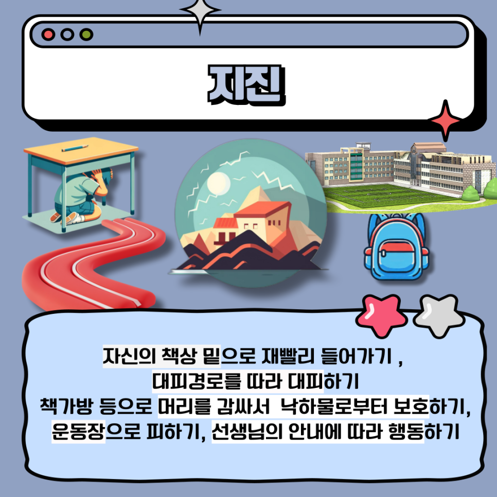지진이 발생했을 때는 즉시 책상 밑으로 피신해야 합니다. 몸을 웅크리고 머리와 목을 손으로 감싸 안전을 확보하며, 충격이 가라앉으면 가방 등 보호 도구를 머리 위로 쓰고 침착하게 대피 경로를 따라 이동해야 합니다.