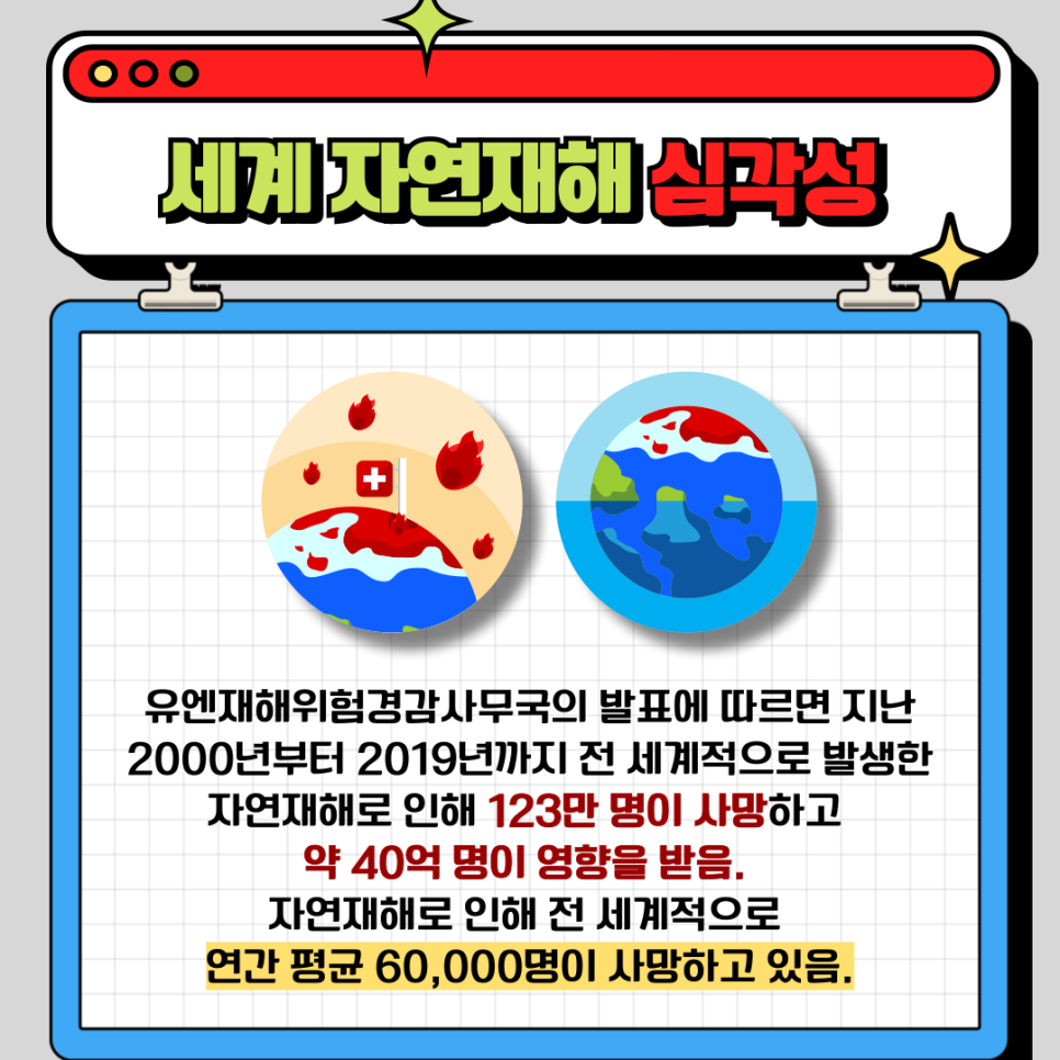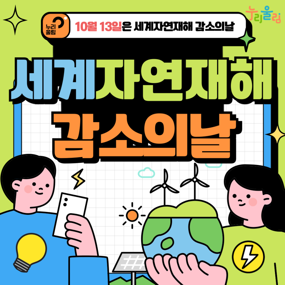 무더위가 한풀 꺾인 여름을 지나, 상쾌한 바람이 불어오는 10월이 우리 주변을 감싸고 있습니다. 올 여름, 전 세계적으로 많은 자연재해 소식이 전해졌는데요. 이번 글에서는 자연재해의 심각성을 돌아보고 경각심을 높이기 위해 국제사회가 지정한 10월 13일 '세계 자연재해 감소의 날'을 소개하고, 학교 안전 교육 및 교육 프로그램에 대해 살펴보겠습니다.