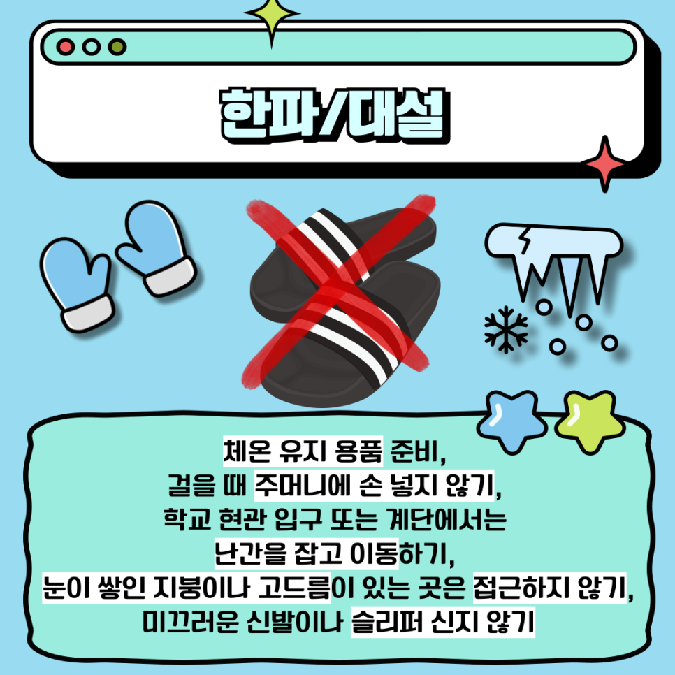 대설, 한파 시에는 체온 유지 용품을 미리 준비하고, 걸을 때 주머니에 손을 넣지 않도록 주의해야 합니다. 특히 눈이 쌓인 지붕이나 고드름이 있는 곳에는 접근하지 않도록 하고, 미끄러운 신발은 피하는 것이 안전합니다.