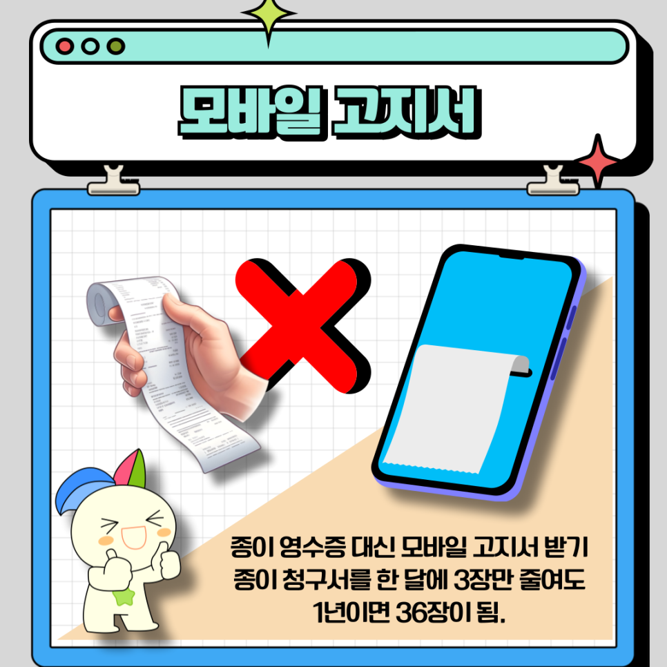 마지막으로 모바일 고지서 받기입니다. 종이 청구서를 한 달에 3장 줄이면, 1년 동안 36장의 종이를 절약할 수 있습니다. 작은 실천이 모여 수천, 수만 그루의 나무를 지키고 우리의 소중한 자연을 보호하는 데 큰 힘이 됩니다. 일상 속 작은 변화가 지구를 위한 큰 변화를 이끌어낼 수 있다는 사실을 기억하고 함께 실천해 봅시다.